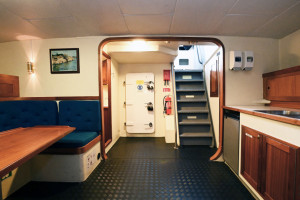 Spacious salon with galley, sofa with table and toilet/shower. Entry to both engine room and a 4 bed cabin.