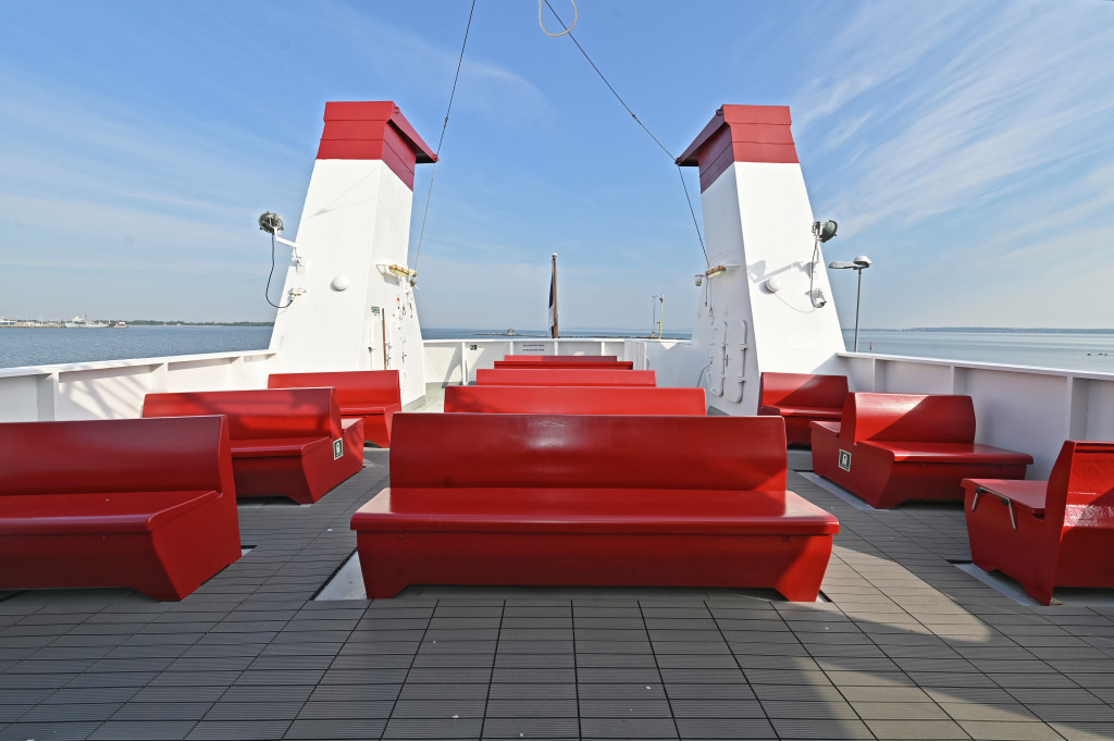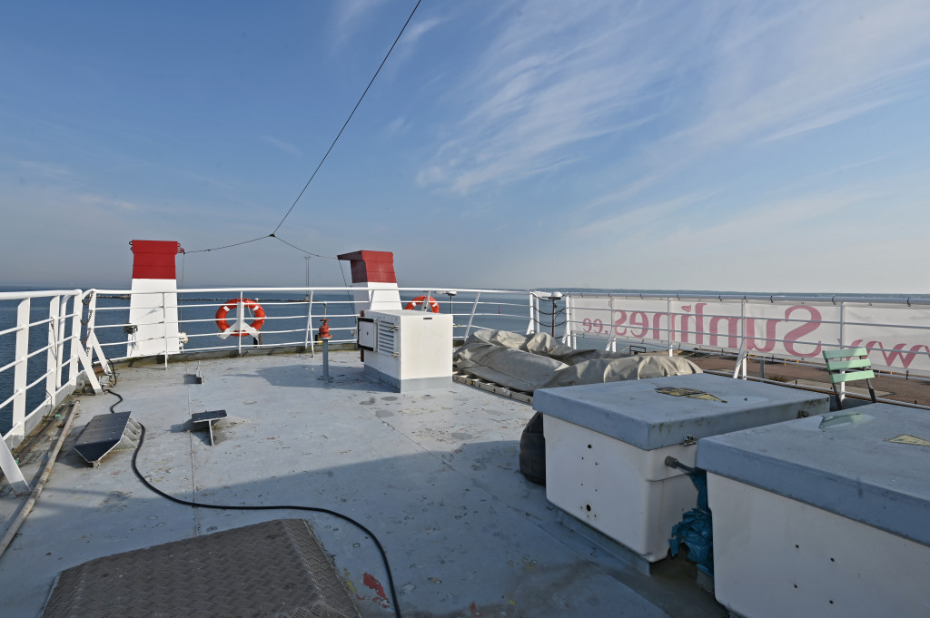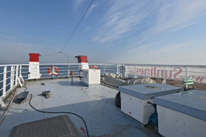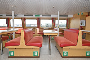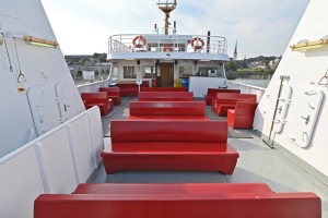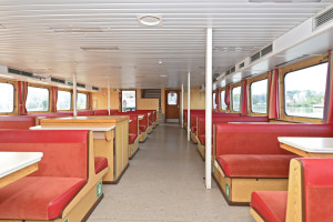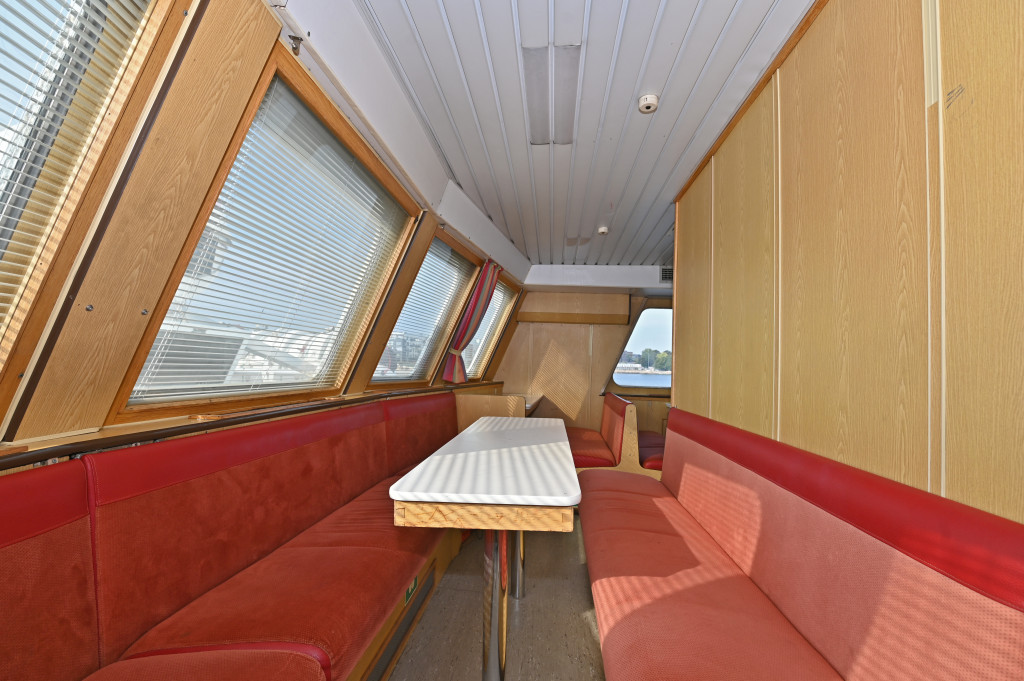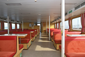 Upper saloon with the same design as the main deck but smaller, approx. 15 tables with sofas. On the sun deck there are approx. 15 benches with life jackets and a small kiosk.