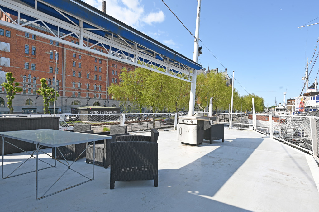 Office barge with berth and building permit in Stockholm, view towards Riddarfjärden and Stockholm City Hall. Approximately 270 square meters of office space on two floors and a further approximately 170 square meters of storage, toilet/shower and conference area below deck (without windows). Large aft deck. See photos and drawings for outline.