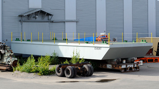 Nybyggd "flat top" pråm. Såld från Finland till Sverige