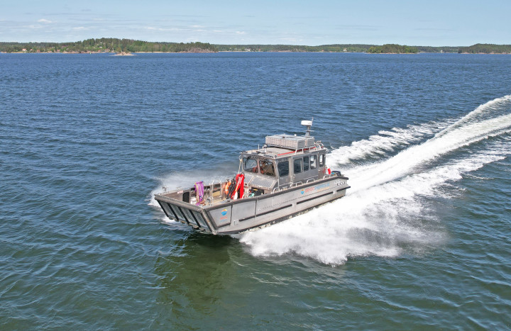 MS Boat C950WT arbetsbåt i aluminium med tilläggsutrustning för att hantera bojstenar upp till 2000 kg. Byggår 2020. 9,50 m x 2,95 m. Hydraulisk och fjärrmanövrerad Fassi-kran och hydraulisk bogramp.