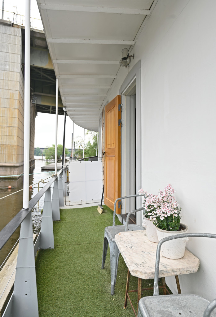 Övre däck med uteplats i aktern. Den, från kajen, insynsskyddade uteplatsen är under tak och har även en eldstad.