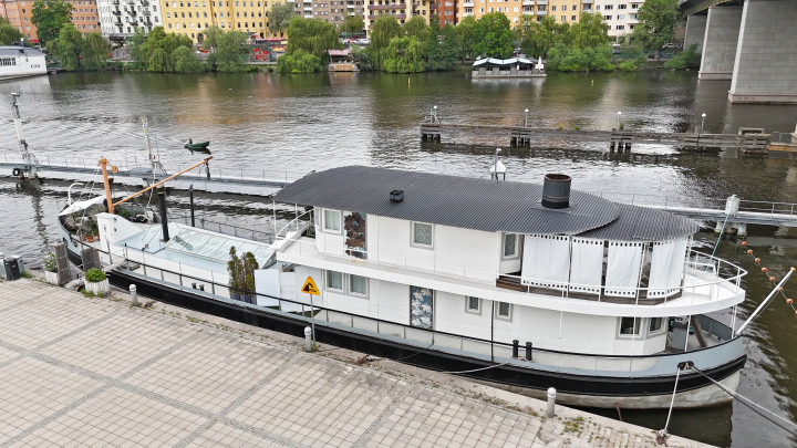 Ljus salong med utsikt över Hornstull. Matplats med braskamin. Modernt och välutrustat kök. Akter om köket finns ytterligare ett rum/kontor. Toalett med dusch och vattenburen golvvärme. Samtliga däcksplan sammanbinds av en spiraltrappa.
